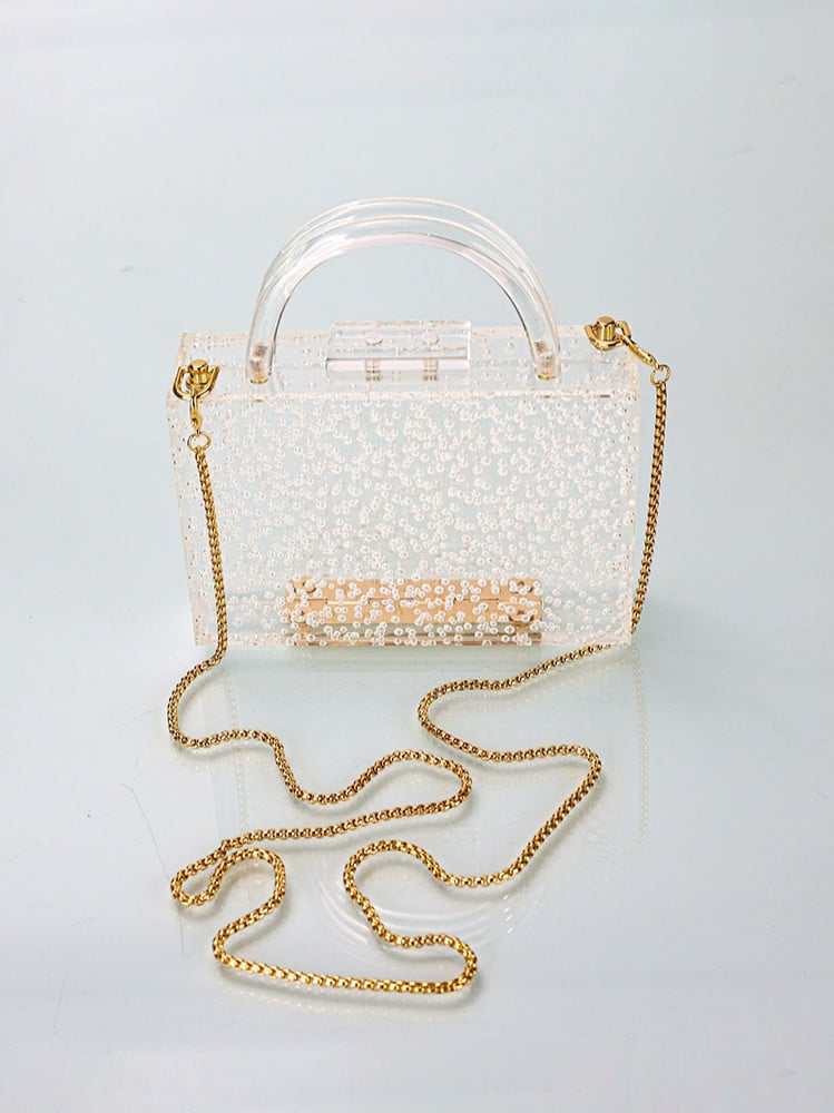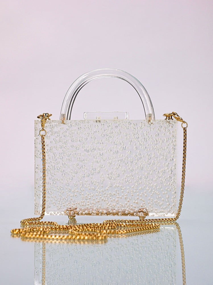 • حقيبة ميني شفافة بشكل صندوق بسلسلة حيث يظيف لك منظر انيق وجذاب مناسب لجميع سهراتك